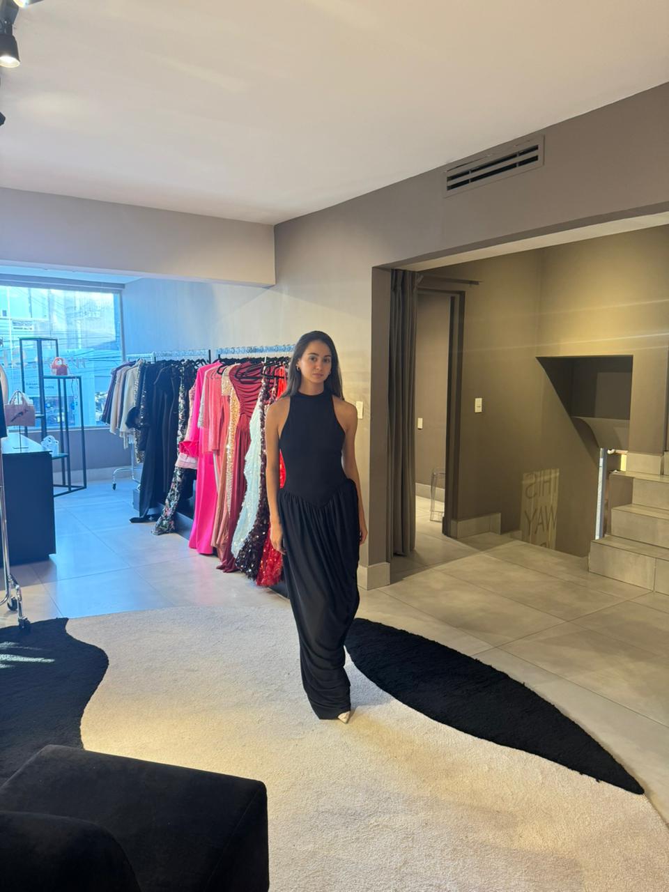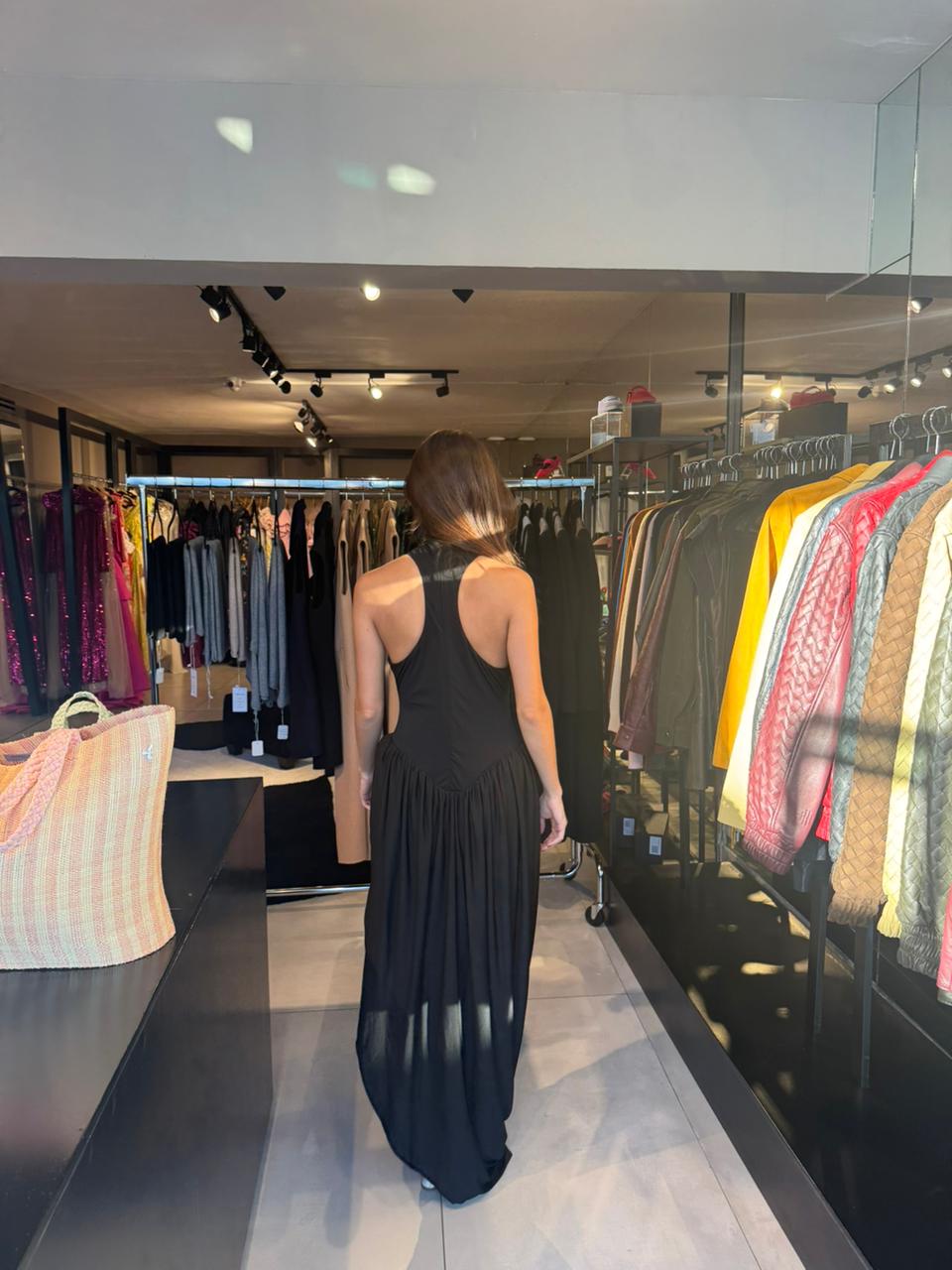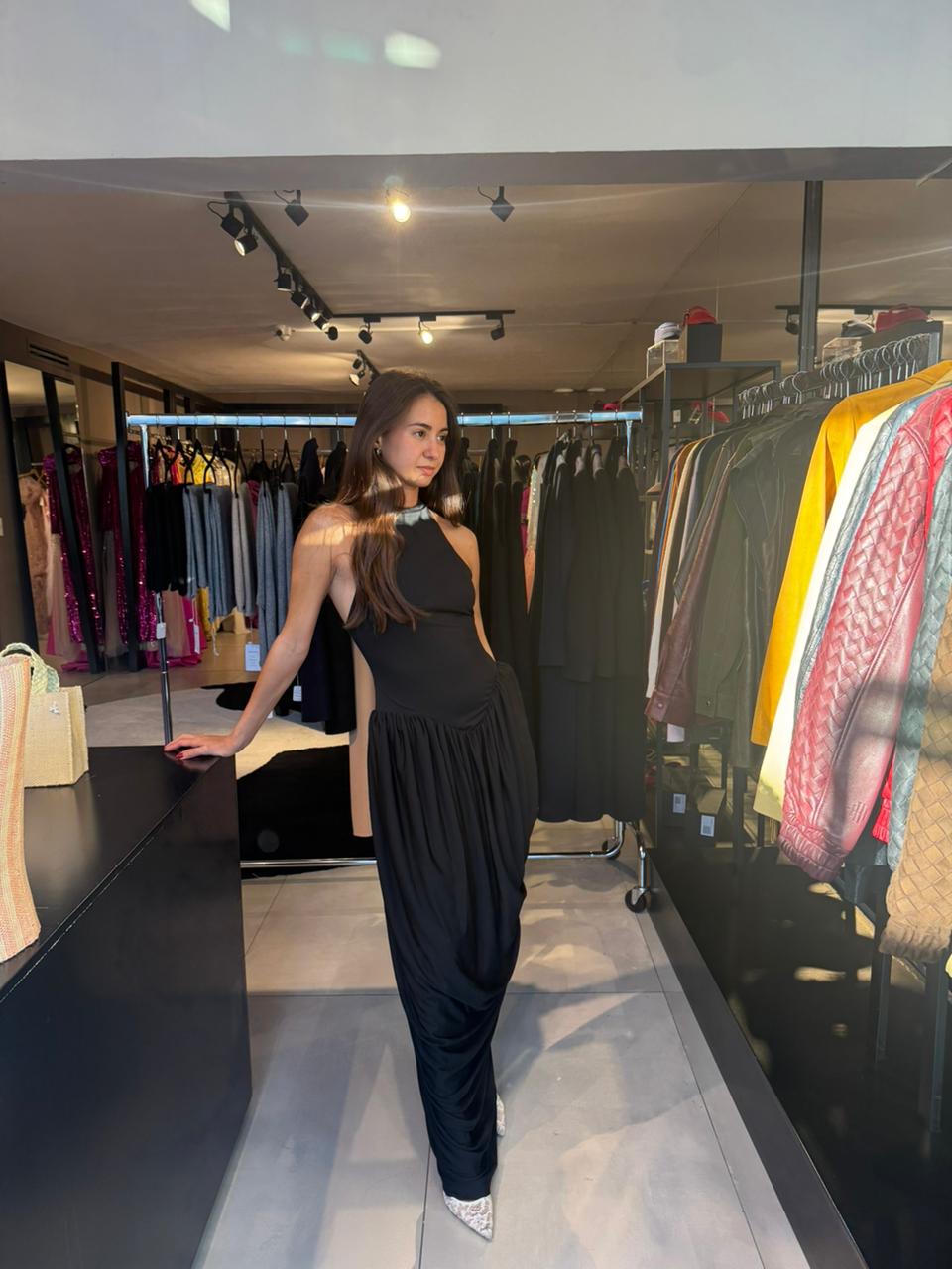 Vestido con volumen en la cintura, caídas asimétricas en la falda y tela strech