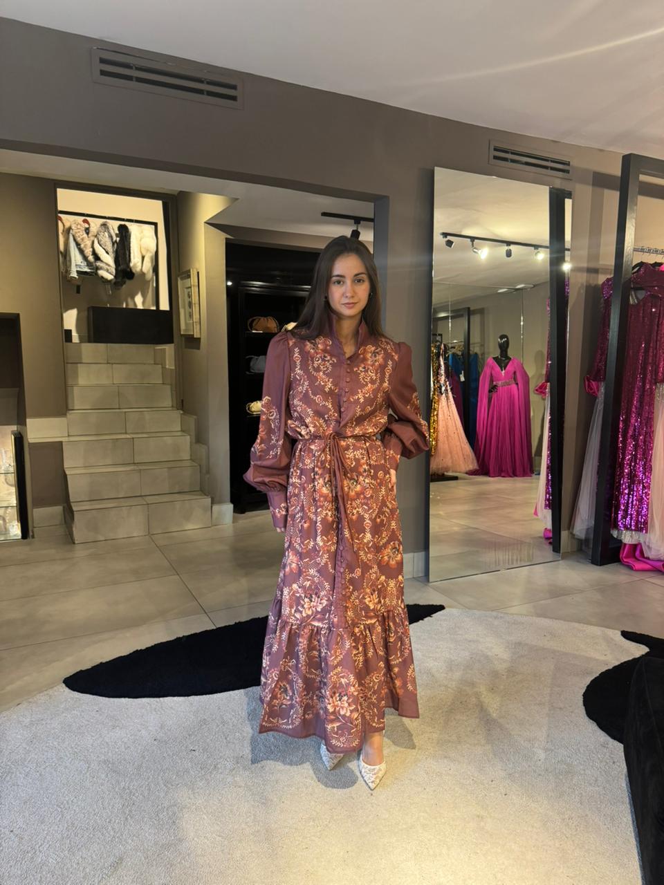 Vestido con cinto ajustable, mangas con volumen y botones forrados.