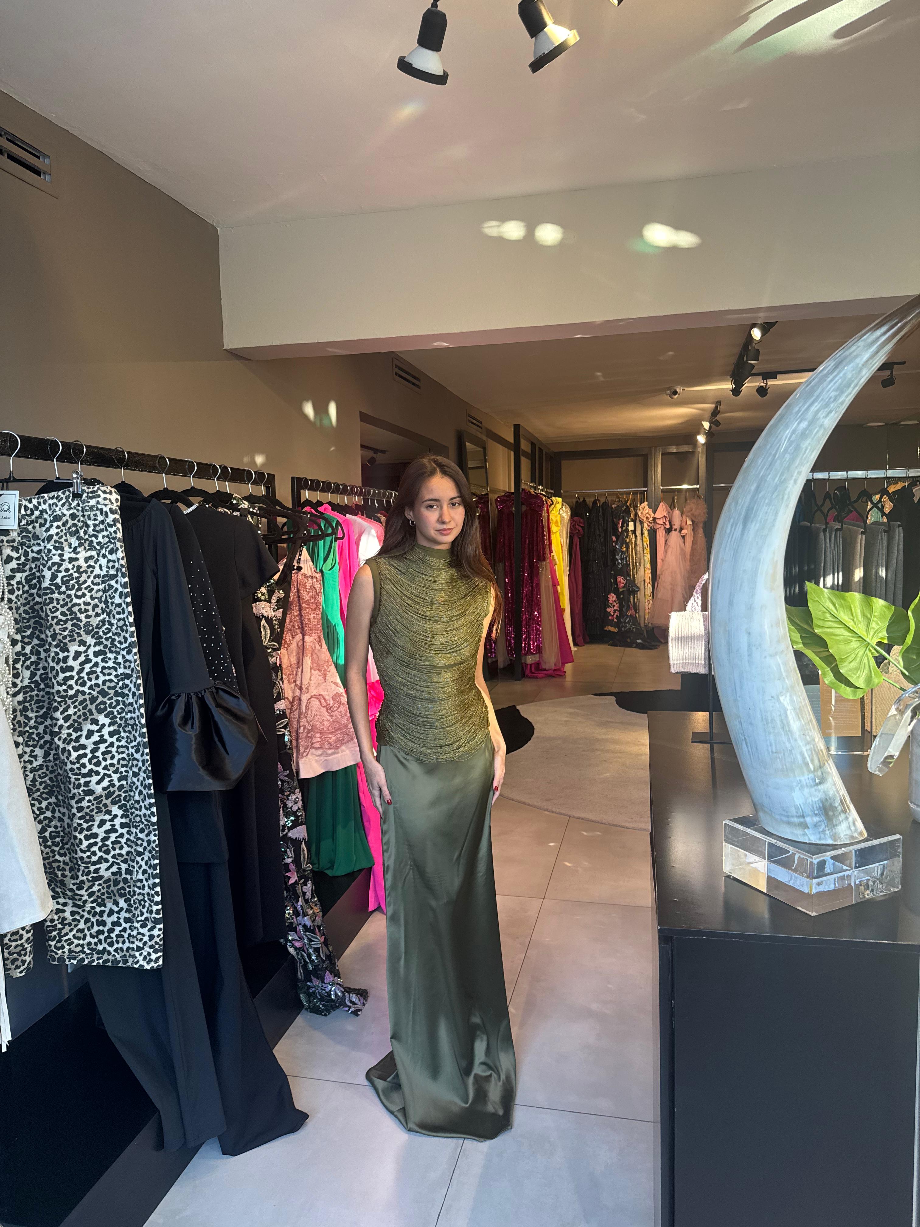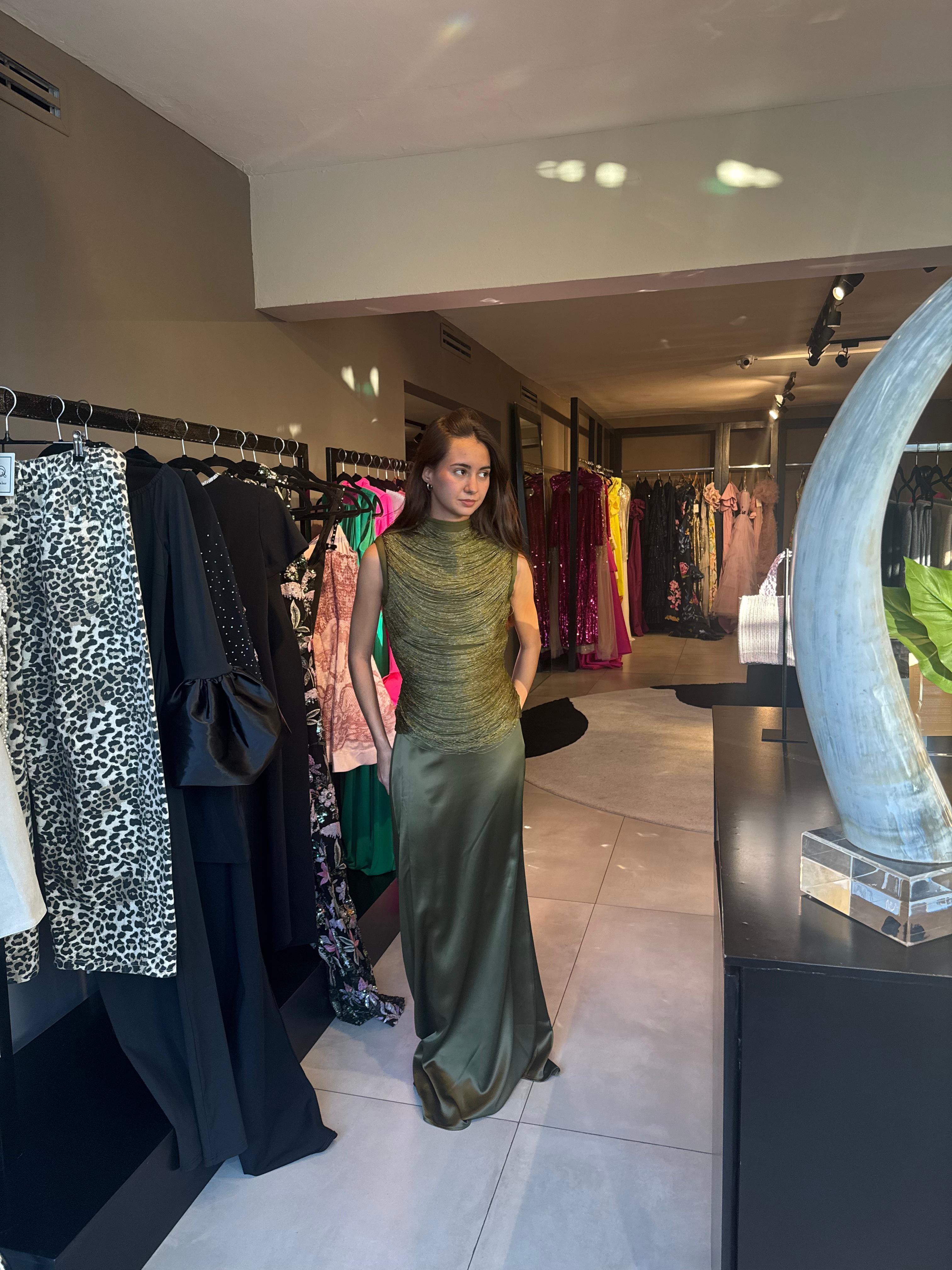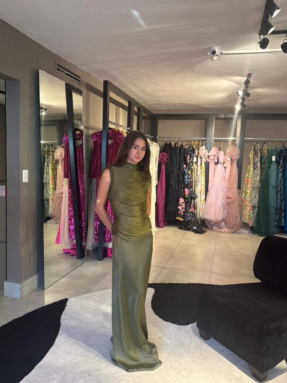 Set de dos piezas. Falda satin y blusa ligeramente strech.
