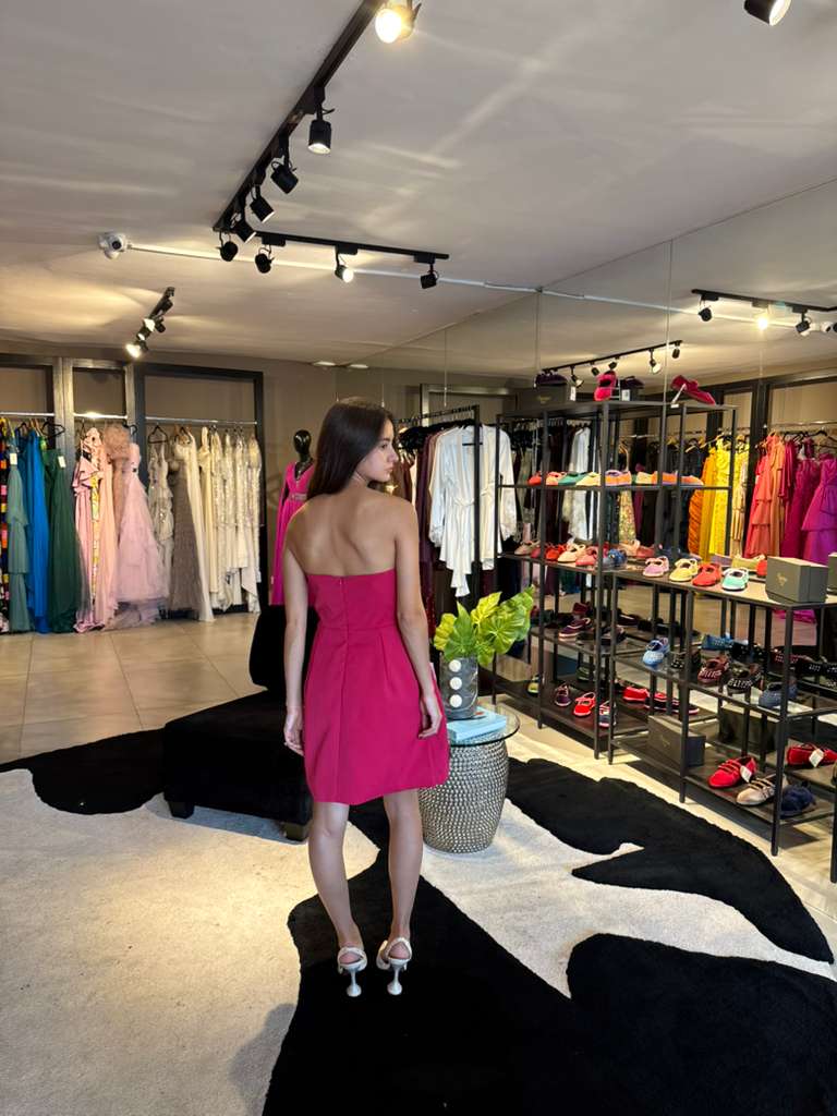 Vestido strapples, con flores por el frente. Ajustado de la parte del busto, cintura y cadera un poco mas suelto