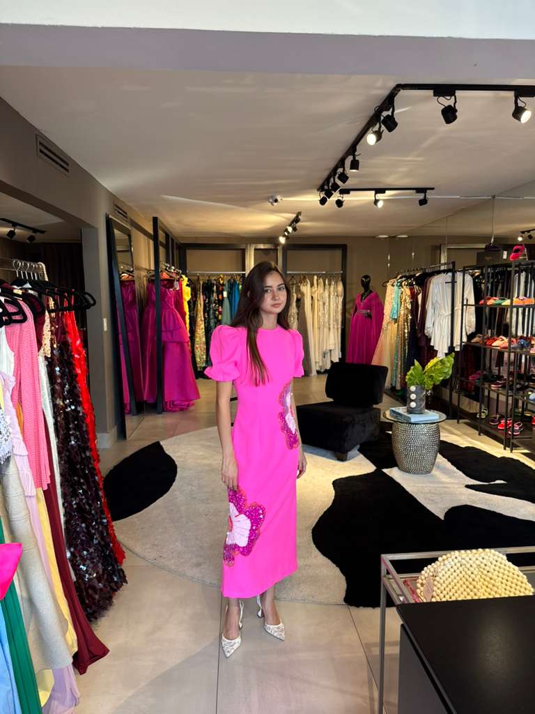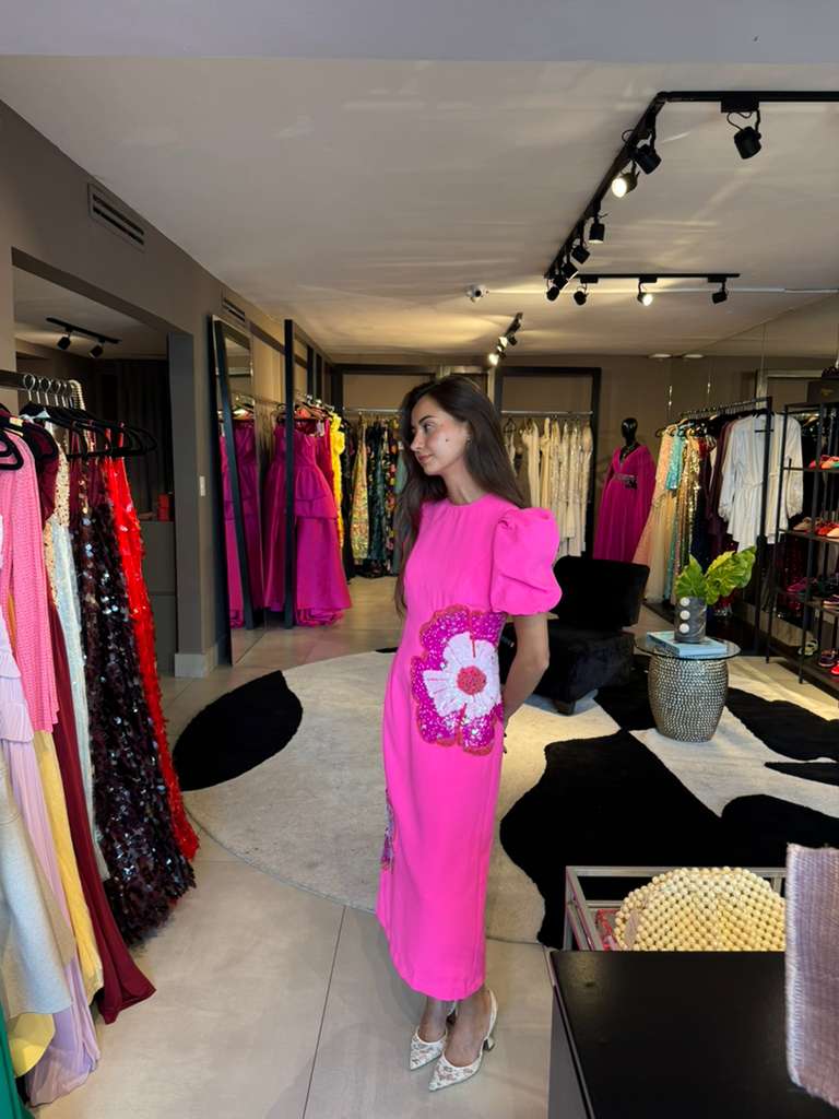 Vestido color rosa midi, flores bordadas y mangas con volumen.