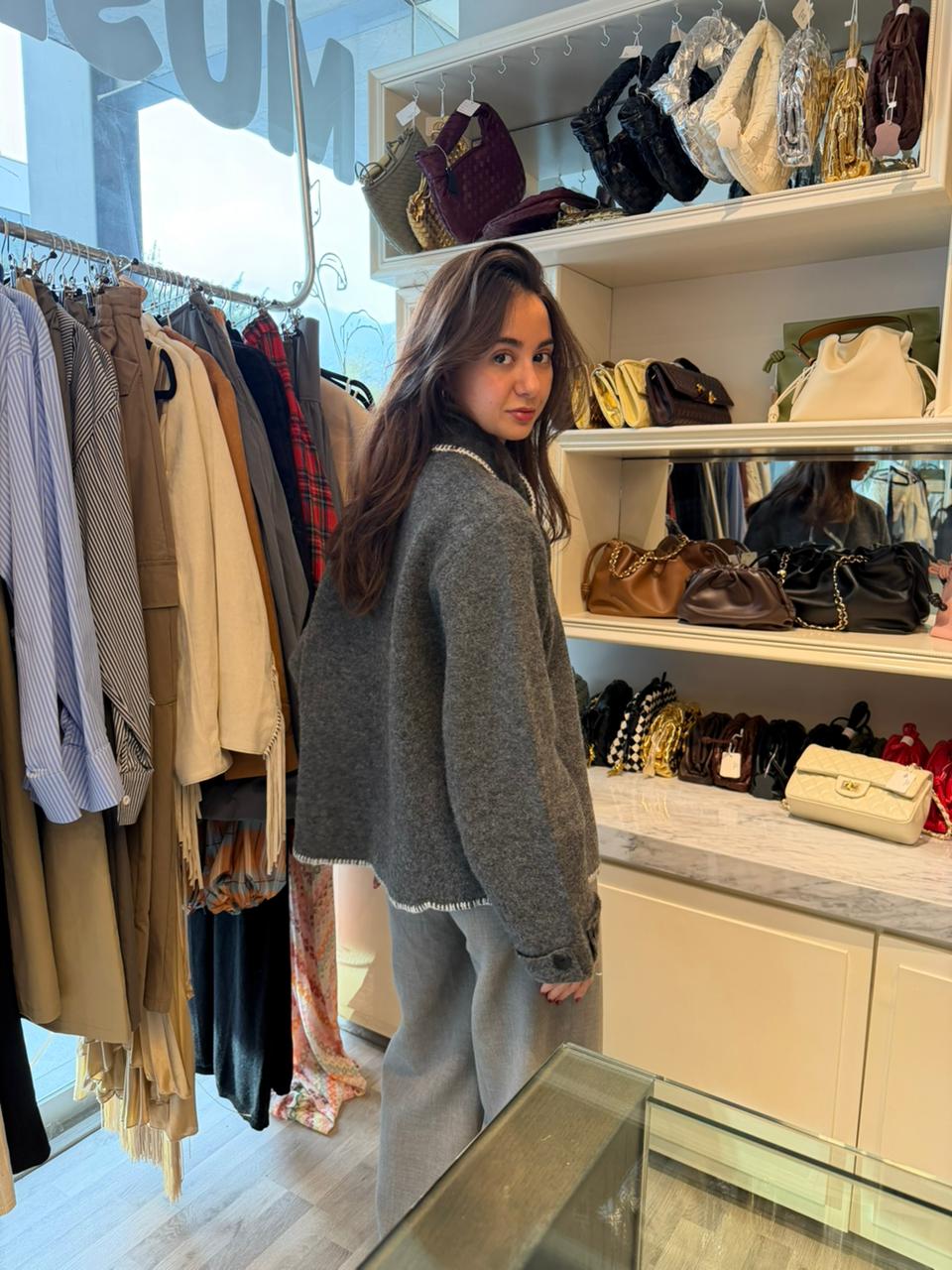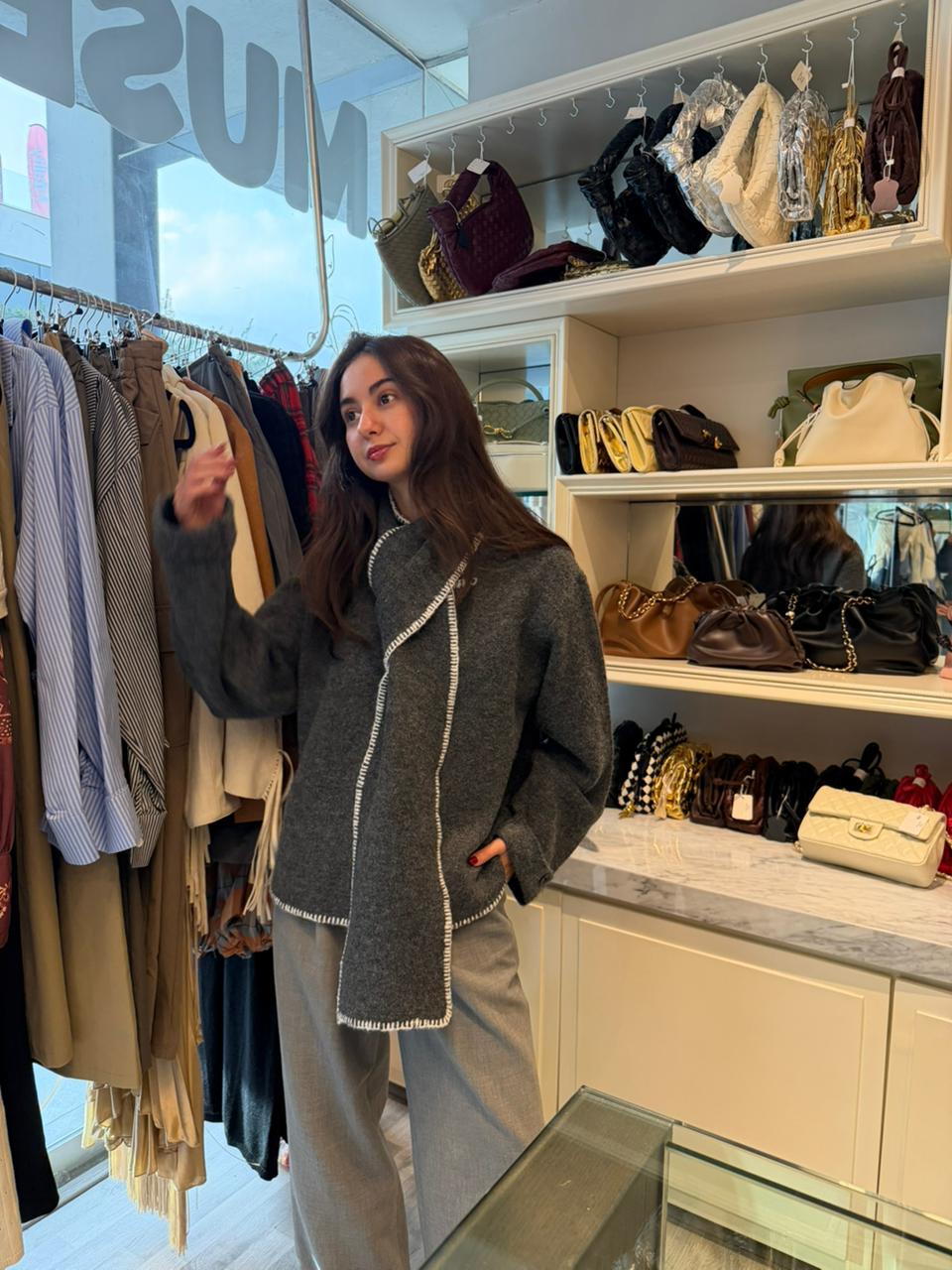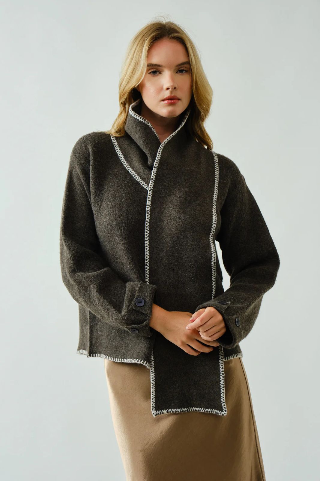 La bufanda se ajusta con unos botones, suéter de punto con bordado en los costados blanco.